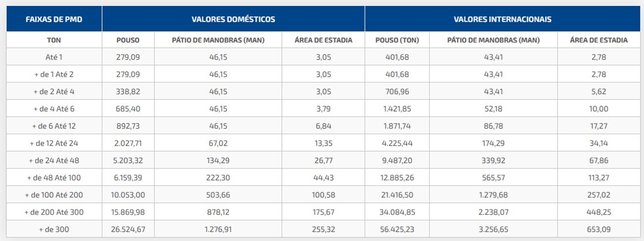 TPE* = tarifa de permanência (cf. valor tabelado correspondente à faixa de peso da aeronave e à categoria do aeroporto de operação)