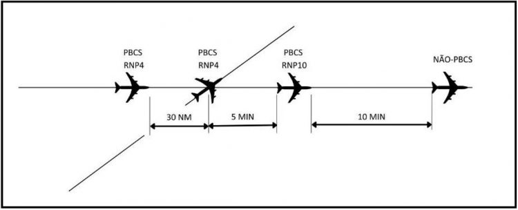 A fase 1 do projeto de implementação do conceito PBCS na FIR Atlântico (SBAO) será inaugurada até o final de 2026 e prevê que as atuais separações longitudinais de 800 MN, ou 10 minutos, entre as aeronaves possam ser reduzidas para 5 minutos, mantendo-se a separação lateral em 50 MN.