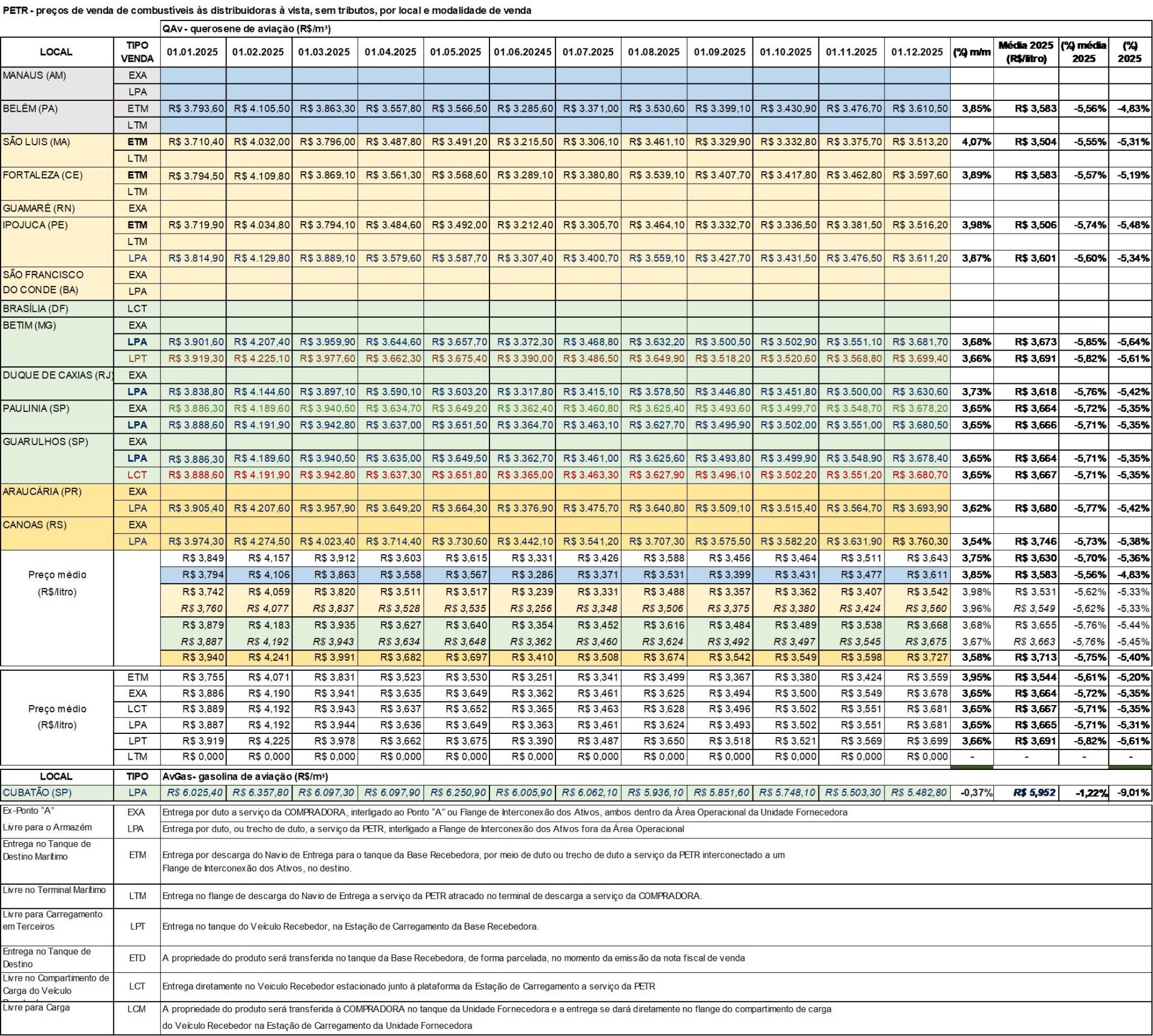 Com base na nova tabela de preços de venda de combustíveis de aviação – querosene de aviação (QAv) e gasolina de aviação (AvGas) – nas refinarias (da PETR), nos principais pontos de vendas do país, para dezembro temos o quadro (abaixo), em que verificamos: