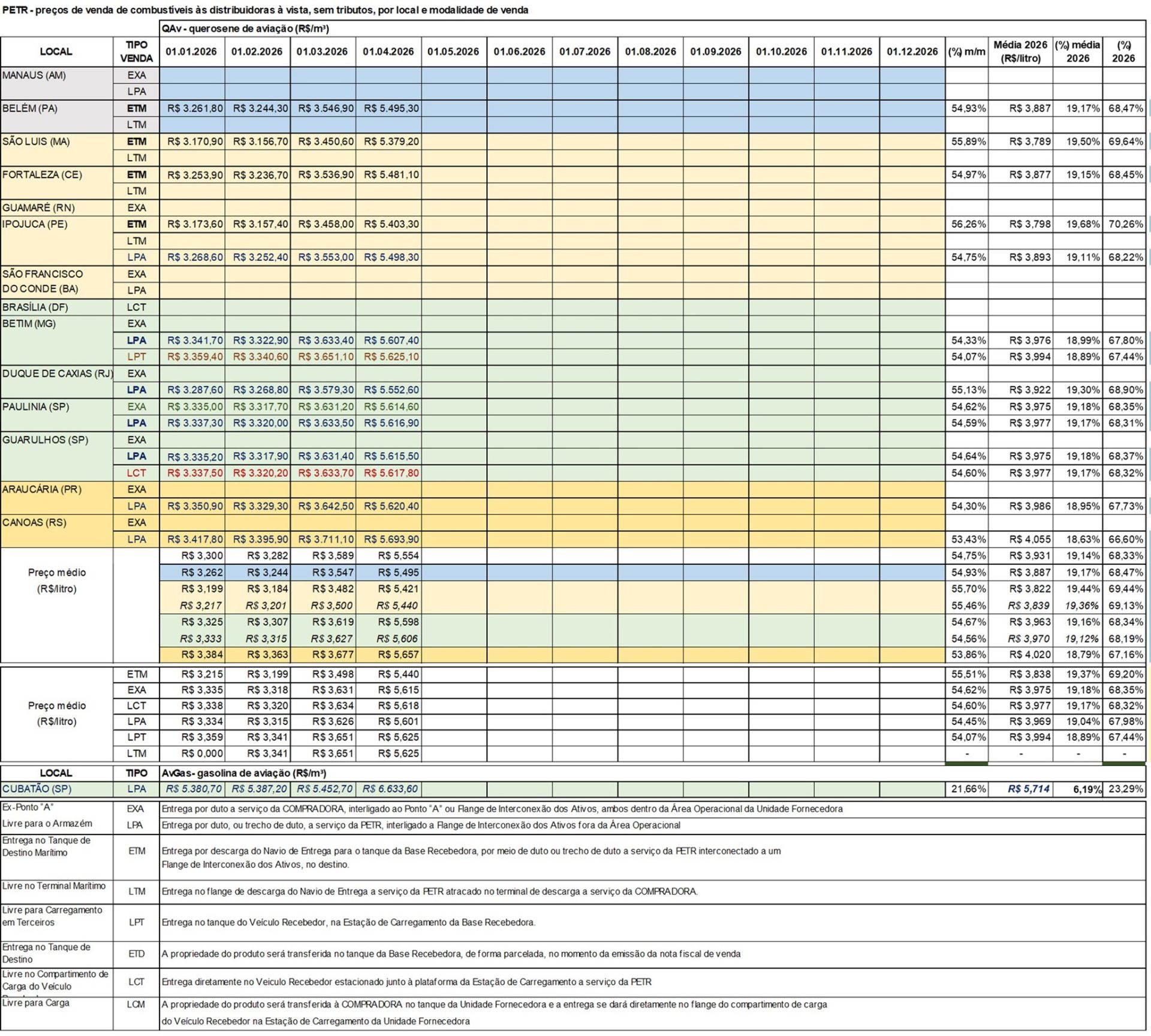 Com base na nova tabela de preços de venda de combustíveis de aviação – querosene de aviação (QAv) e gasolina de aviação (AvGas) – nas refinarias (da PETR), nos principais pontos de vendas do país, para abril temos o quadro (abaixo), em que verificamos: