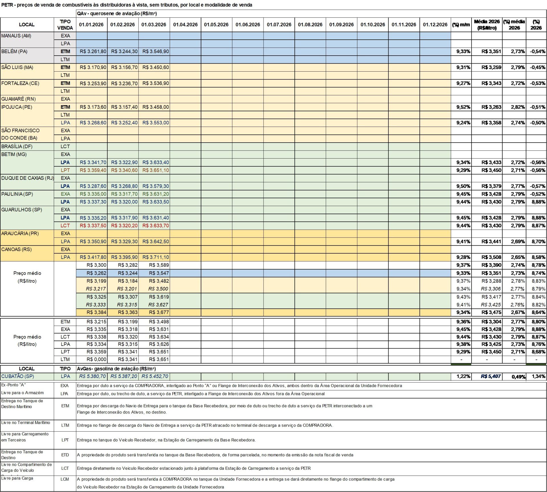 Com base na nova tabela de preços de venda de combustíveis de aviação – querosene de aviação (QAv) e gasolina de aviação (AvGas) – nas refinarias (da PETR), nos principais pontos de vendas do país, para março temos o quadro (abaixo), em que verificamos: