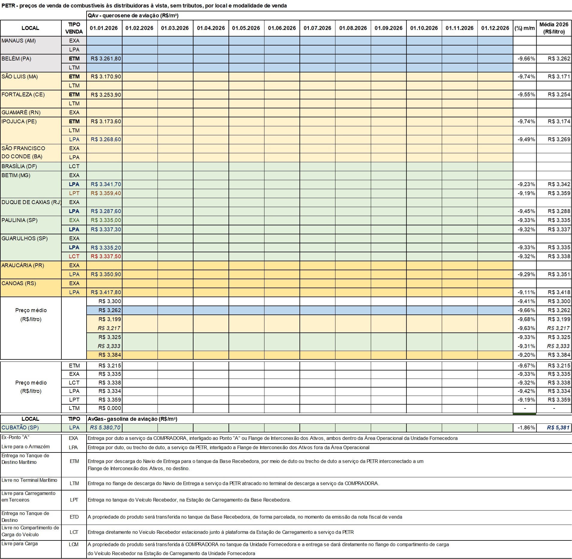 Com base na nova tabela de preços de venda de combustíveis de aviação – querosene de aviação (QAv) e gasolina de aviação (AvGas) – nas refinarias (da PETR), nos principais pontos de vendas do país, para janeiro temos o quadro (abaixo), em que verificamos: